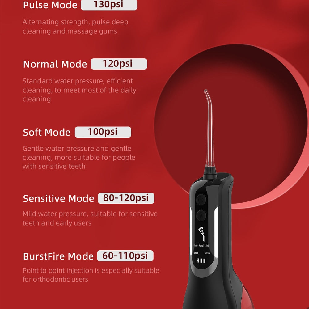 2.The oral irrigator is 5 modes available. By using it 2-3 times a day, you can prevent tooth decay/gingival atrophy/bleeding gums/dental calculus, etc.