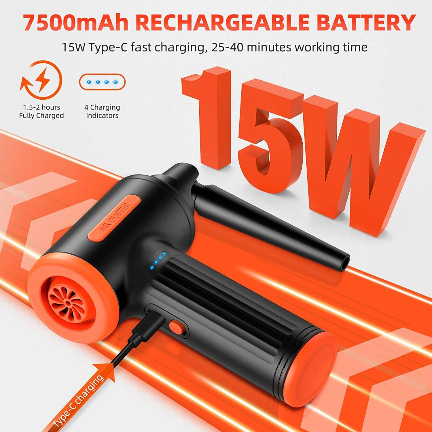Equipped with a Type-C charging port with 15W fast charging, it only takes 1.5-2 hours to fully power the cordless air duster. 7500mAh large-capacity battery guarantees 25-40 minutes of battery life. 4 charging indicators solve battery anxiety, allowing you to more accurately grasp the charging time.