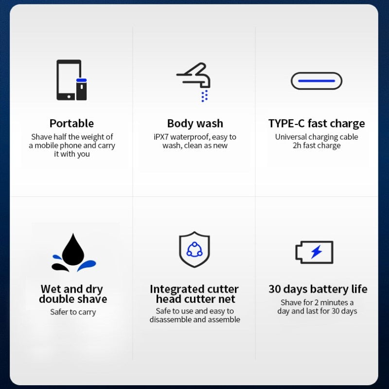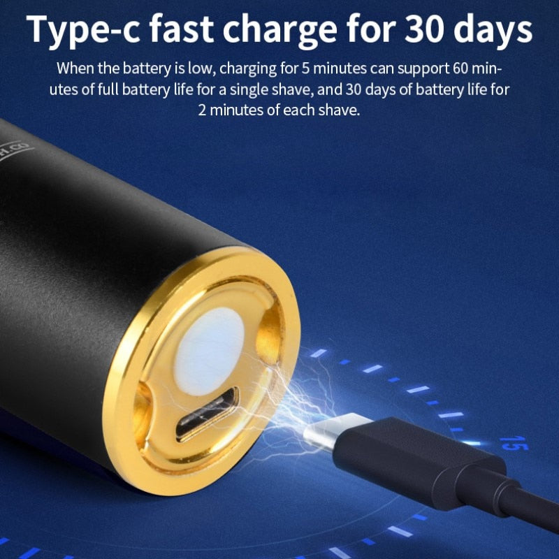 Type-C Smart Charging: This electric shaver has a built-in polymer battery, which can be used for up to 1.5 hours of cordless shaving after 6 hours of charging.