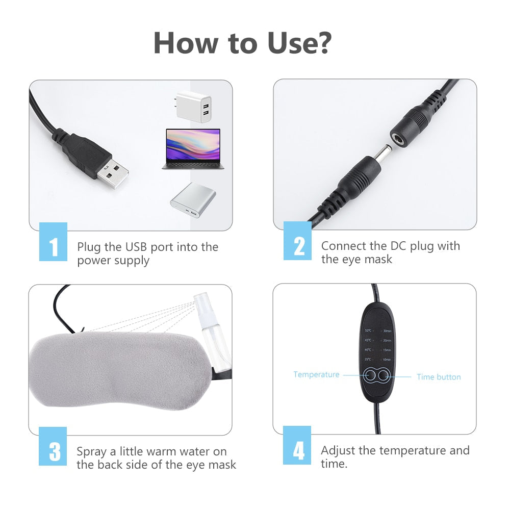 3.Comes with a hand controller, through which you can customize the heating time ranging 10min-15min-20 min-30 min and heating temperature 35℃-40℃-45℃-50℃. The eye mask will auto shut down when the time is up.