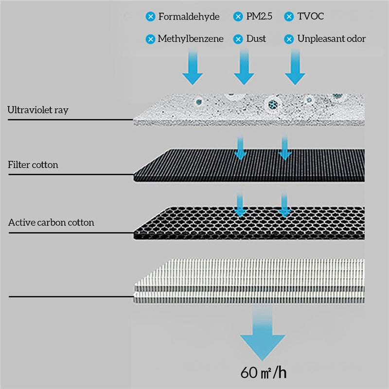 【High Efficiency】Ultraviolet ray is adopted for physical disinfection, non-toxic, no residues, no odor, no second pollution. High-efficient purification.