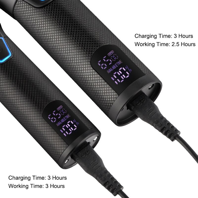 【Smart LED Display & Large Capacity Battery】: The LED display can clearly display the percentage of remaining power, speed, oil level reminder, and charging reminder. The large men's hair clipper is equipped with a 1800mAh lithium-ion battery, which can be used for 150 minutes after 3 hours of charging. The battery capacity of the small trimmer is 900mAh, and it can be used for 120 minutes after 3 hours of charging.